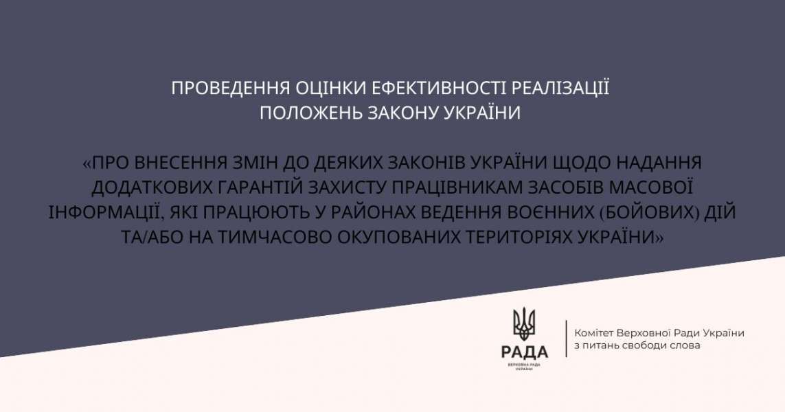 Комітет Верховної Ради України з питань свободи слова (надалі - Комітет) розпочинає роботу з проведення оцінки ефективності реалізації положень Закону України «Про внесення змін до деяких законів України щодо надання додаткових гарантій захисту працівникам засобів масової інформації, які працюють у районах ведення воєнних (бойових) дій та/або на тимчасово окупованих територіях України» від 08.07.2022 року №2382-IX (надалі – Закон).