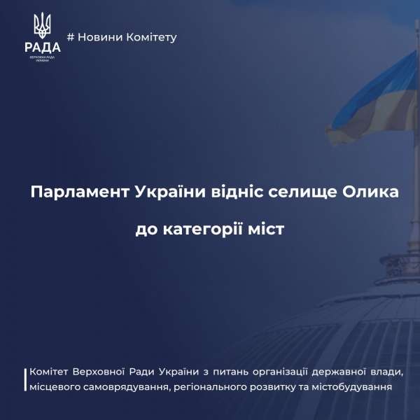 Верховна Рада України на пленарному засіданні 17 квітня 2025 року розглянула проект Постанови про віднесення селища Олика Луцького району Волинської області до категорії міст (реєстр. №12304) та за результатами розгляду ухвалила його в цілому.