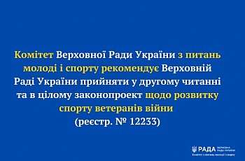 Верховною Радою України був ухвалений за основу проект Закону про внесення змін до Закону України "Про фізичну культуру і спорт" щодо спорту ветеранів війни (реєстр. №12233), та доручено Комітету з питань молоді і спорту доопрацювати його до другого читання.
