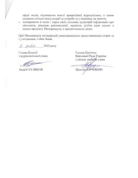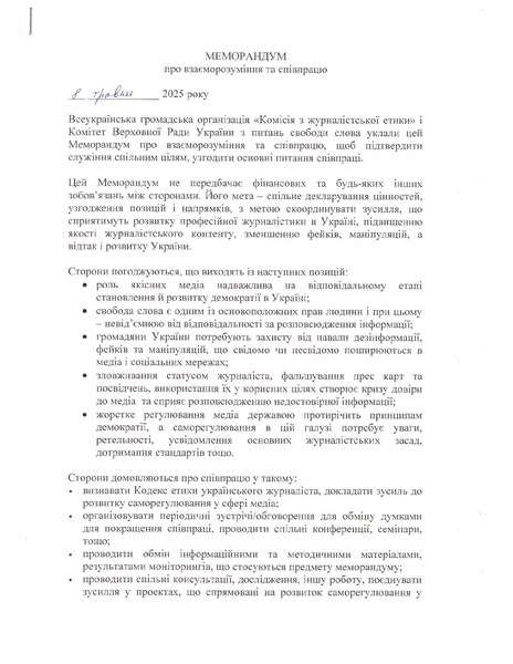 Цей меморандум - не просто документ, а крок до більшої прозорості, відповідальності та співпраці між державними структурами, громадянським суспільством і медіаспільнотою. Метою угоди є спільне декларування цінностей, узгодження позицій і напрямків для координування зусиль, що сприятимуть розвитку професійної журналістики в Україні, підвищенню якості журналістського контенту, зменшенню фейків, маніпуляцій та розвитку України.