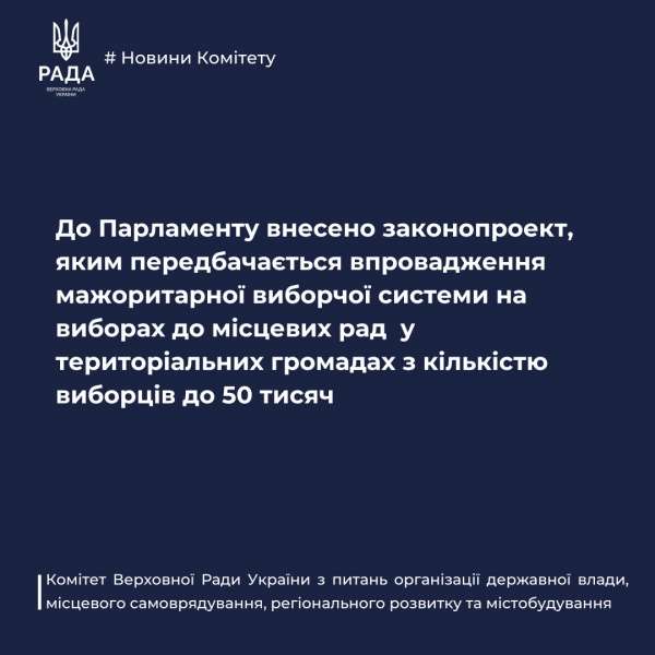 Для реалізації мети законопроекту пропонується внести зміни до низки статей Виборчого кодексу, що регламентують засади організації та проведення місцевих виборів, якими передбачити проведення виборів депутатів сільської, селищної, міської ради у територіальних громадах з кількістю виборців до 50 тисяч за мажоритарною системою відносної більшості.