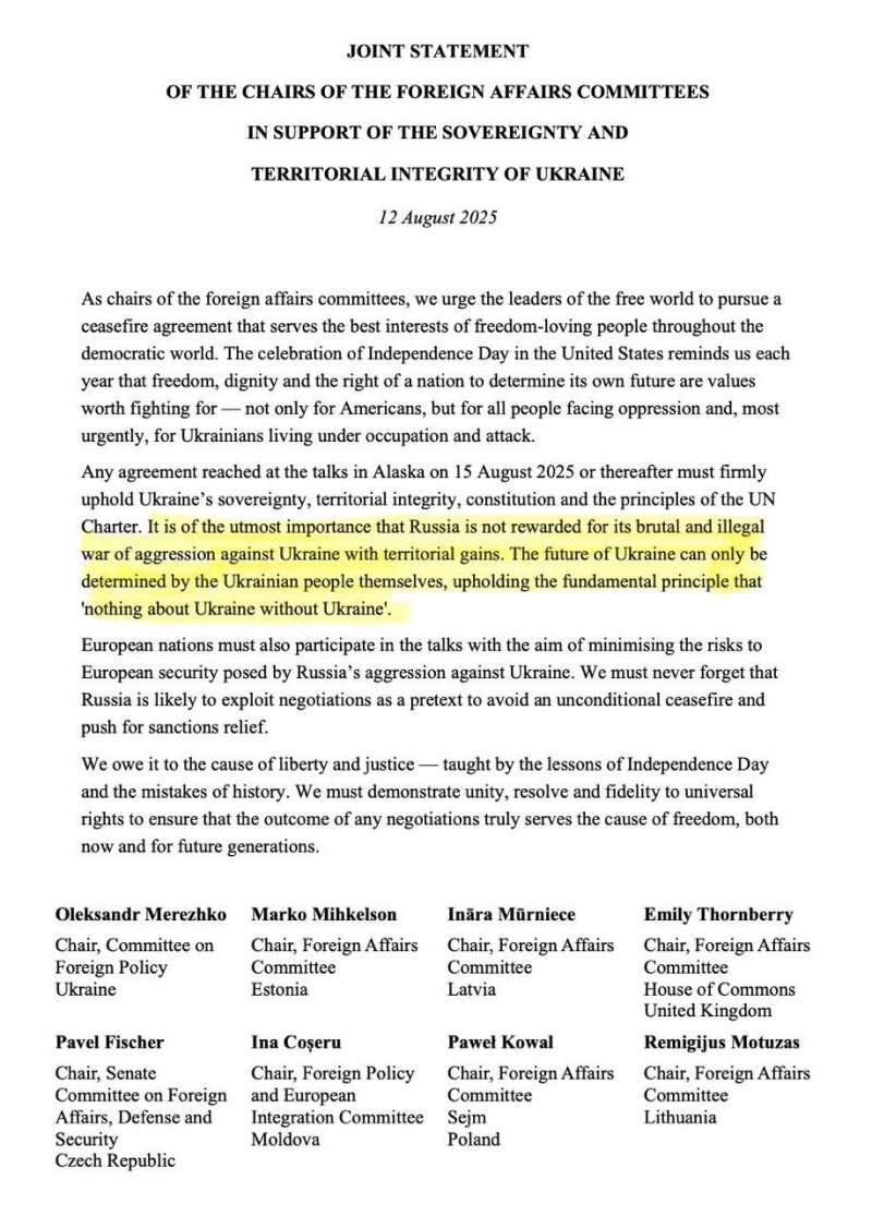Учасники заяви підкреслили: будь-які домовленості, досягнуті на переговорах на Алясці 15 серпня чи пізніше, повинні беззастережно гарантувати суверенітет, територіальну цілісність та конституційний лад України, а також дотримання принципів Статуту ООН. росія не має отримати жодних територіальних вигод від своєї агресії, а майбутнє України можуть визначати виключно українці.