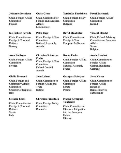 Під документом підписалися голови комітетів із закордонних справ України, Естонії, Латвії, Великої Британії, Чеської Республіки, Молдови, Польщі, Литви, Фінляндії, Люксембургу, Болгарії, Ісландії, Норвегії, Австрії, Європейського Парламенту, Бельгії, Швеції, Франції, Німеччини, Італії, Ірландії, Нідерландів та Данії.