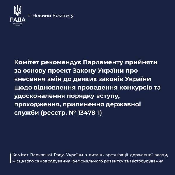 Метою законопроекту про внесення змін до деяких законів України щодо відновлення проведення конкурсів та удосконалення порядку вступу, проходження, припинення державної служби (реєстр. №13478-1) є удосконалення порядку вступу, проходження та звільнення з державної служби, відновлення конкурсів на зайняття посад державної служби відповідно до індикаторів 1.2 та 1.3 Плану України.