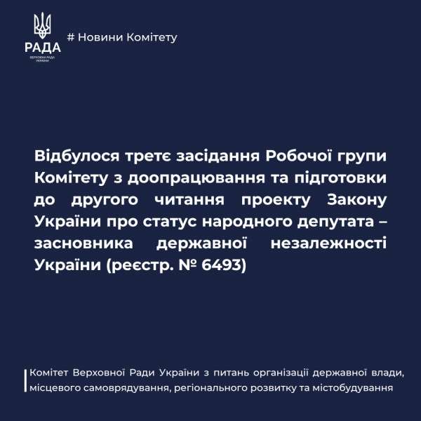 22 вересня 2025 року відбулося третє засідання Робочої групи Комітету з доопрацювання та підготовки до другого читання проекту Закону України про статус народного депутата - засновника державної незалежності України (реєстр. №6493).