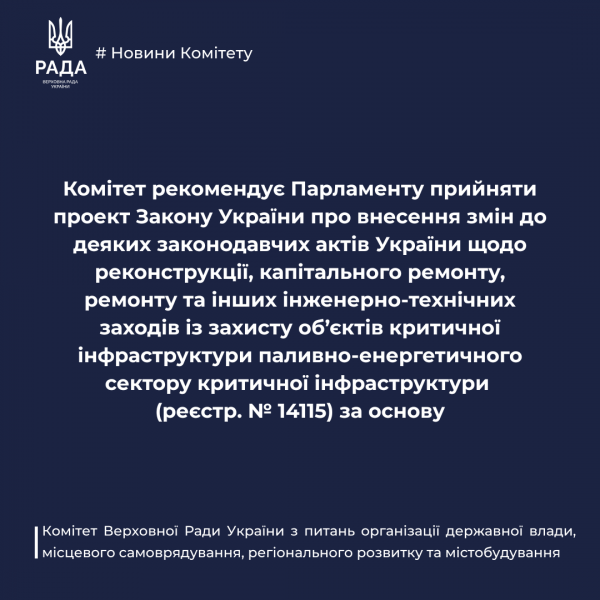 Комітет з питань організації державної влади, місцевого самоврядування, регіонального розвитку та містобудування 14 листопада 2025 року розглянув проект Закону України про внесення змін до деяких законодавчих актів України щодо реконструкції, капітального ремонту, ремонту та інших інженерно-технічних заходів із захисту об’єктів критичної інфраструктури паливно-енергетичного сектору критичної інфраструктури (реєстр. №14115) і ухвалив висновок рекомендувати Парламенту включити його до порядку денного чотирнадцятої сесії Верховної Ради України дев’ятого скликання та за наслідками розгляду в першому читанні прийняти за основу.