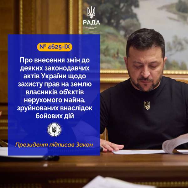 17 грудня 2025 року Президент України Володимир Зеленський підписав Закон України «Про внесення змін до деяких законодавчих актів України щодо захисту прав на землю власників об’єктів нерухомого майна, зруйнованих внаслідок бойових дій», №4625-IX від 08.10.2025.