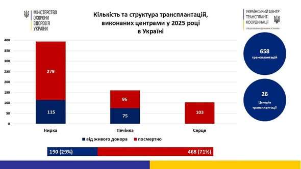 Наразі розвиток системи призвів до того, що трансплантації стали рутинними. За минулий рік у 26 центрах медики виконали 658 органних пересадок, тоді як у 2024 році їх було 516. Найбільше таких операцій провели у Першому медичному об'єднанні Львова (154), Національному науковому центрі хірургії та трансплантології імені О.О. Шалімова (105) та у Київській міській клінічній лікарні №1 (91). Найбільшу кількість трансплантацій серця виконано в Інституті серця (63), печінки - у клініці «Оберіг» (57), а нирок - у Першому медичному об'єднанні Львова (109).