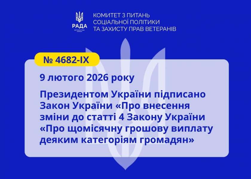 9 лютого 2026 року Президентом України підписано Закон України «Про внесення зміни до статті 4 Закону України «Про щомісячну грошову виплату деяким категоріям громадян» № 4682-ІХ.