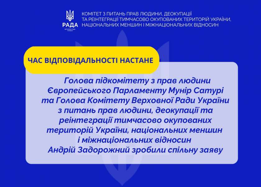 Голова підкомітету з прав людини Європейського Парламенту Мунір Сатурі та Голова Комітету Верховної Ради України з питань прав людини, деокупації та реінтеграції тимчасово окупованих територій України, національних меншин і міжнаціональних відносин Андрій Задорожний 24 лютого зробили спільну заяву.