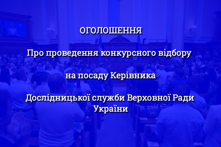 Відповідно до пункту 20 Положення про Дослідницьку службу Верховної Ради України, затвердженого розпорядженням Голови Верховної Ради України від 11 серпня 2022 року № 438 та розпорядження Голови Верховної Ради України від 26 серпня 2022 року №753-к «Про проведення конкурсного відбору на посаду Керівника Дослідницької служби Верховної Ради України» оголошується проведення конкурсного відбору на посаду Керівника Дослідницької служби Верховної Ради України (далі – конкурсний відбір).