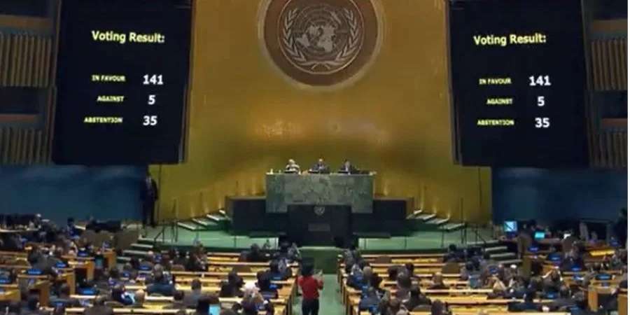 Про це повідомляється на офіційному Twitter ООН.За проголосувала 141 держава, проти п’ять (Росія, Білорусь, Сирія, КНДР, Еритрея), утрималися 35 (серед них Китай, Індія, ПАР, Казахстан, Пакистан, Іран, Ірак, Куба, ЦАР).