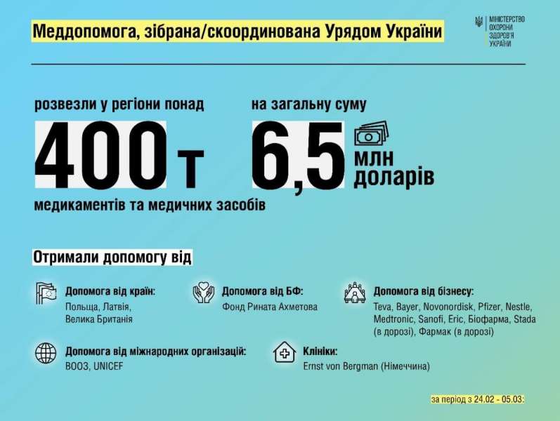 За словами Михайла Радуцького, найбільше допомоги надійшло з Польщі, Латвії, Великої Британії та Данії, а також від міжнародних організації ВООЗ та UNICEF.