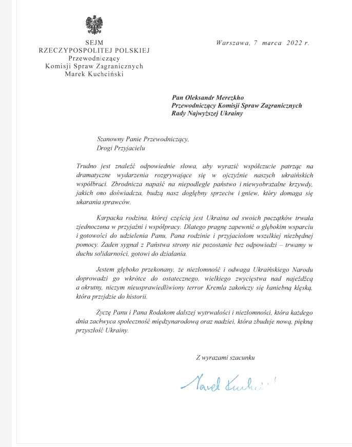 Карпатська родина, частиною якої є і Україна, від самого початку була об’єднана, дружня та налаштована на співпрацю. Саме тому я хочу упевнити у нашій глибокій підтримці та готовності до надання Вам, Вашій родині та друзям усілякої необхідної допомоги. Жоден сигнал з вашого боку не залишиться без відповіді - ми усі солідарні з вами та готові до дій.