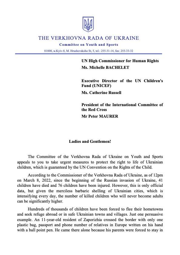Комітет Верховної Ради України з питань молоді і спорту звертається до Вас про вжиття невідкладних заходів щодо захисту права на життя українських дітей, що гарантоване Конвенцією ООН про права дитини.