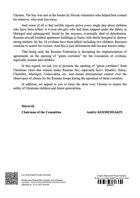 Крім того, звертаємося до Вас щодо закриття неба над Україною для забезпечення безпеки українських дітей та майбутніх поколінь.