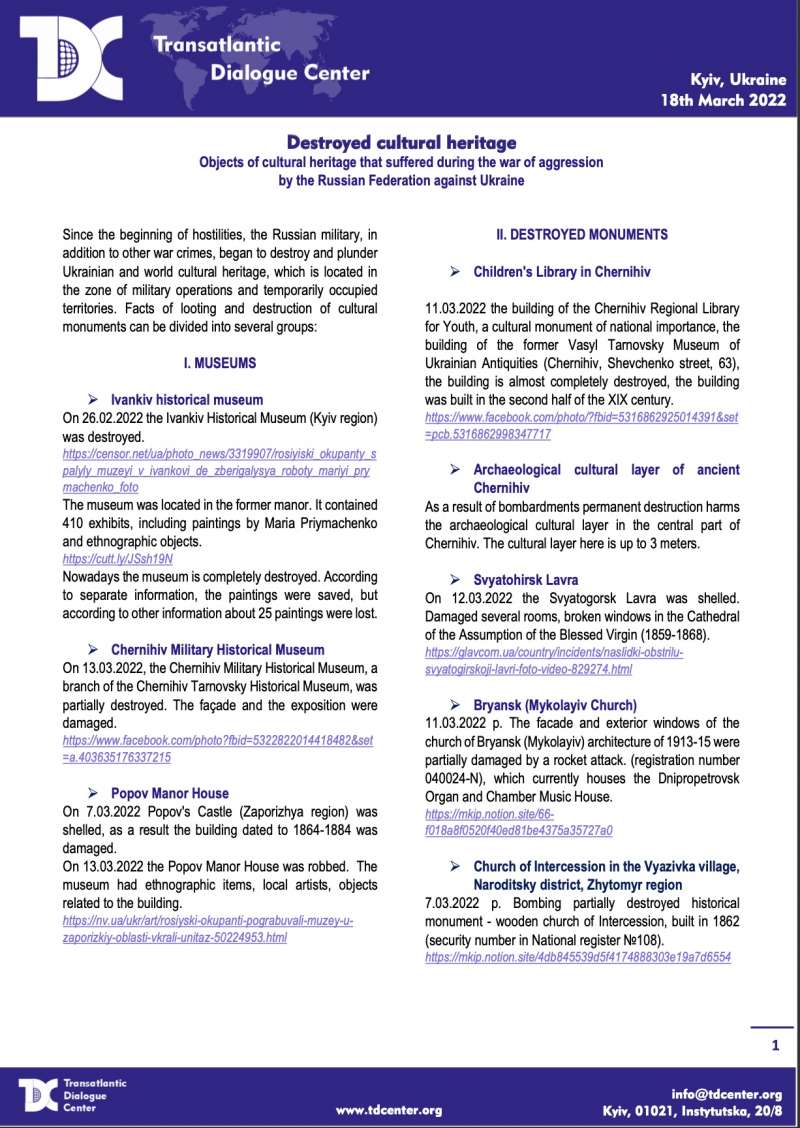 Комітет Верховної Ради України з питань гуманітарної та інформаційної політики продовжує висвітлювати факти звірства російських загарбників в Україні. Сьогодні Комітет проінформував про культурні злочини понад 100 адресатів, серед яких парламенти країн Європи та міжнародні організації у сфері культури, туризму тощо.