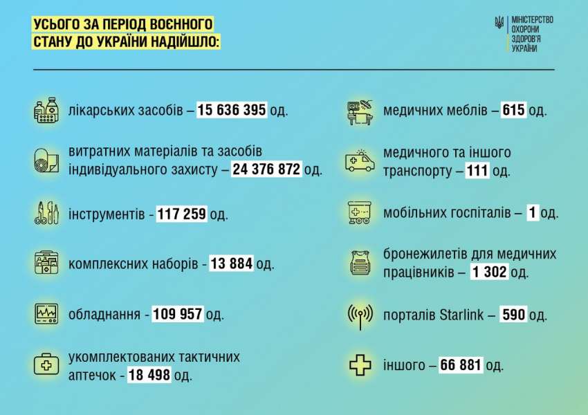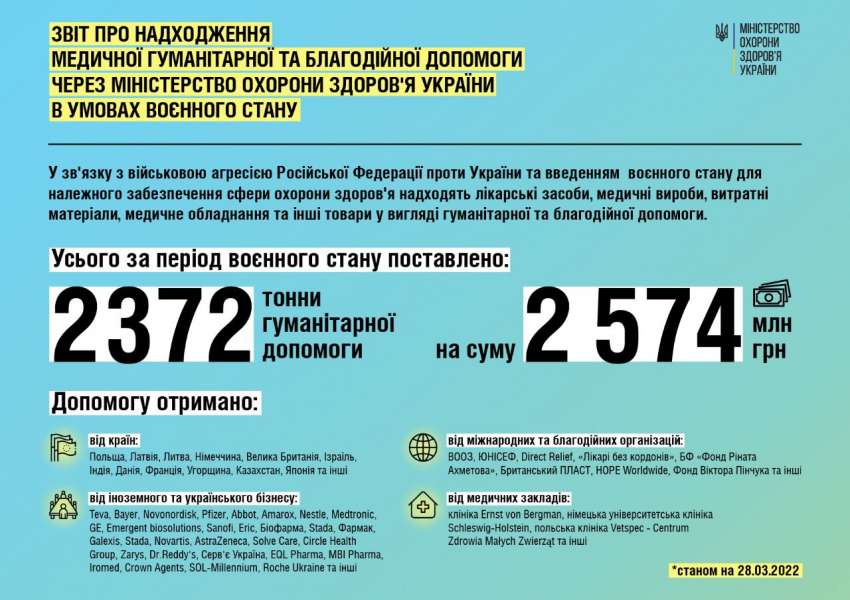 З перших днів російського вторгнення гуманітарною та благодійною допомогою медичного спрямування нашу державу активно підтримують такі країни як: Польща, Латвія, Литва, Німеччина, Велика Британія, Ізраїль, Індія, Данія, Франція, Угорщина, Казахстан, Японія та інші.
