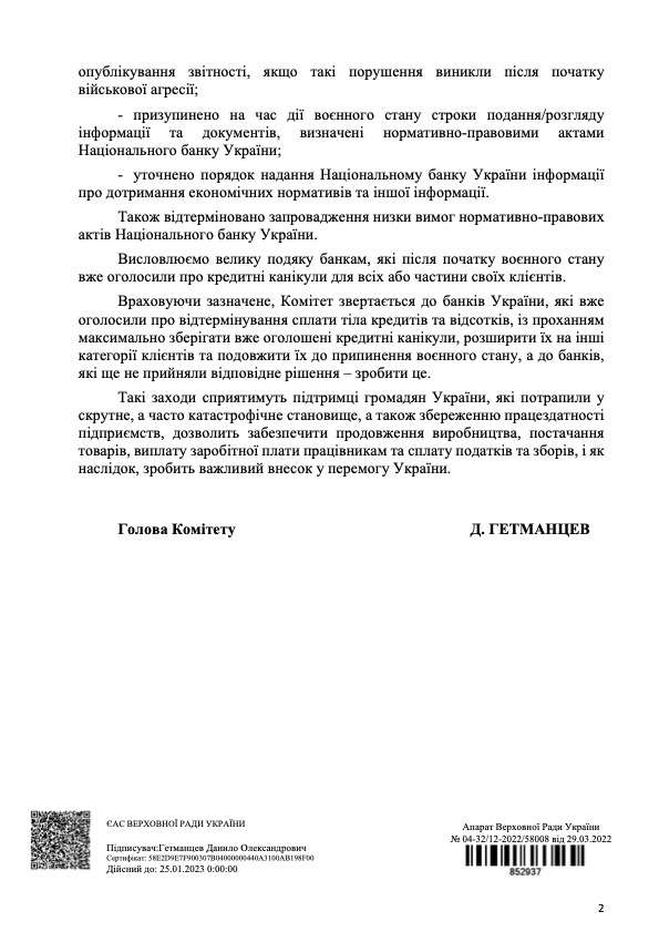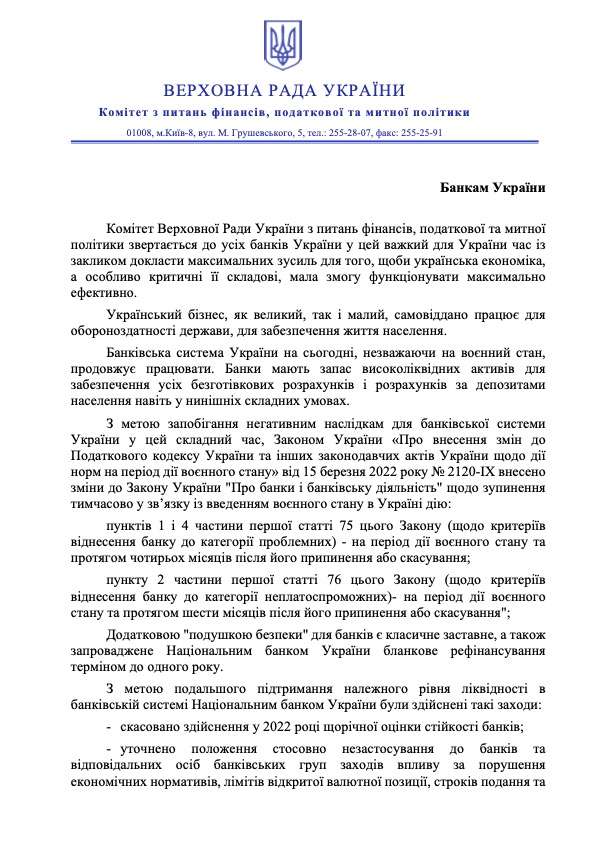 Враховуючи зазначене, Комітет звертається до банків України, які вже оголосили про відтермінування сплати тіла кредитів та відсотків, із проханням максимально зберігати вже оголошені кредитні канікули, розширити їх на інші категорії клієнтів та подовжити їх до припинення воєнного стану, а до банків, які ще не прийняли відповідне рішення - зробити це.