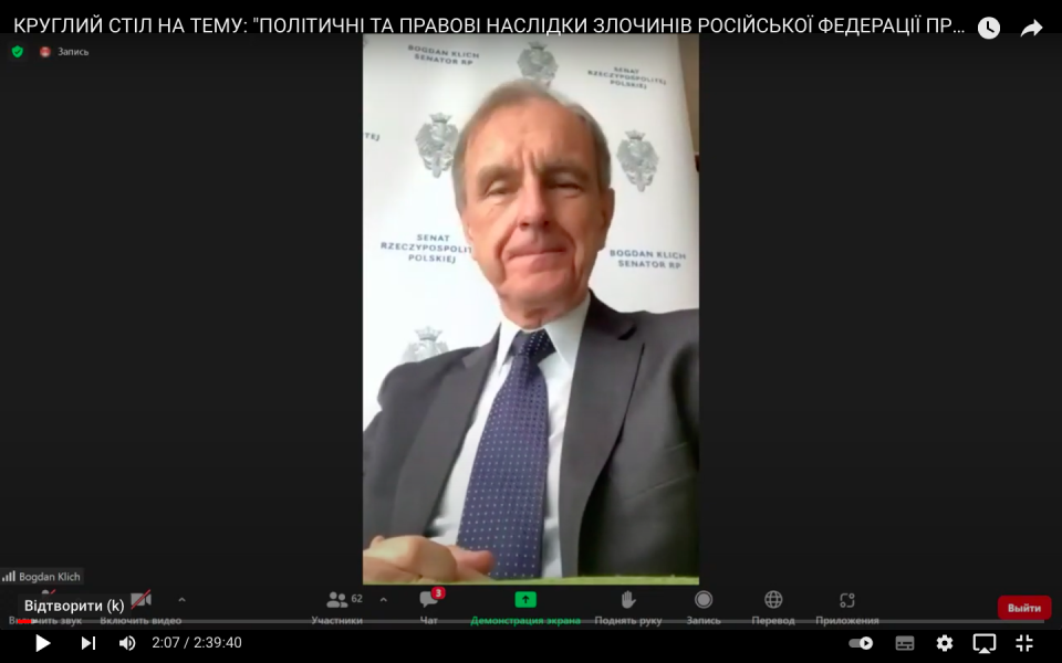 Голова Комітету у закордонних справах Сенату Республіки Польща Богдан Кліх, окрім підтримки України в гуманітарному, військовому плані, також зазначив, що Республіка Польща буде підтримувати якнайшвидший вступ України до Європейського Союзу.