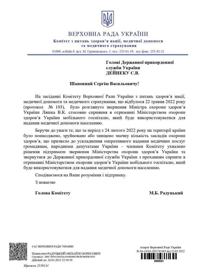 Також Комітет підтримав звернення Міністра охорони здоров’я Віктора Ляшка стосовно сприяння в отриманні Міністерством мобільного госпіталю, який буде використовуватися для надання медичної допомоги населенню.