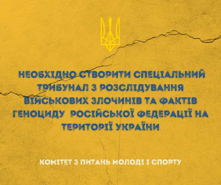Тому Комітет Верховної Ради України з питань молоді і спорту вважає за необхідне створення принципового нового органу - Спеціального трибуналу з розслідування військових злочинів та актів геноциду російської федерації під час агресії проти українського народу. Саме цей орган має вкрай швидко зібрати факти, що підтверджують військові злочини та факти геноциду на території та забезпечити швидке притягнення винних до відповідальності. Комітет з питань молоді і спорту вважає, що вже в червні мають пройти перші засідання Спеціального трибуналу, можливо з використанням заочного правосуддя та винесені перші вироки.