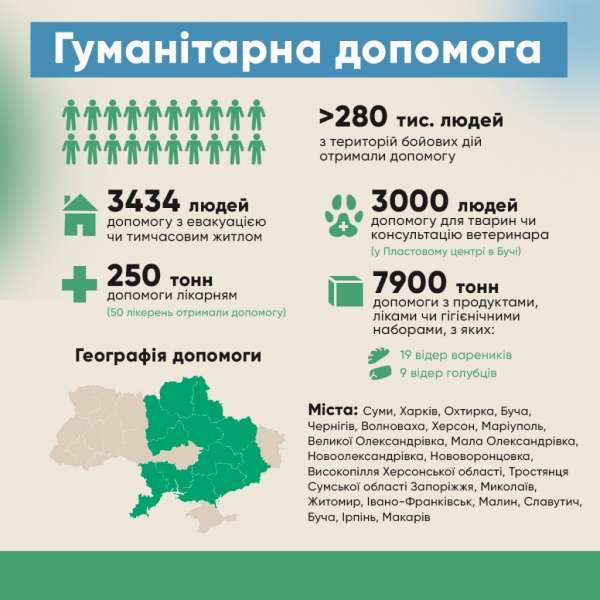 Тільки за нашими підрахунками, завдяки зусиллям пластунів гуманітарну допомогу отримали щонайменше 280 тисяч людей. Це тисячі прийнятих з теплом тимчасових переселенців, а також сотні тонн продуктів, засобів гігієни, медикаментів.