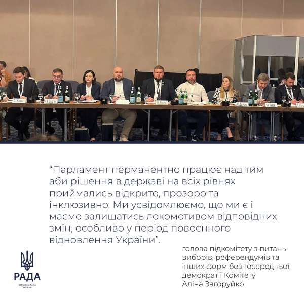 Саме цю проблему парламент і хоче вирішити. Парламент перманентно працює над тим аби рішення в державі на всіх рівнях приймались відкрито, прозоро та інклюзивно. Ми усвідомлюємо, що ми є і маємо залишатись локомотивом відповідних змін, особливо у період повоєнного відновлення України»- вказала А.Загоруйко.