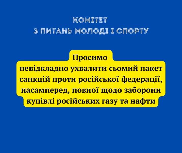 Саме тому Комітет Верховної Ради України з питань молоді і спорту наполягає на невідкладному ухваленні сьомого пакету санкцій з відповідними заборонами. Громадяни держави-агресора мають своїми гаманцями відчути ціну війну, а рашистська армія втратити фінансовий ресурс. Крім того, це позбавить рф можливості шантажувати європейські держави відключенням поставок газу, чим вона зараз успішно займається.
