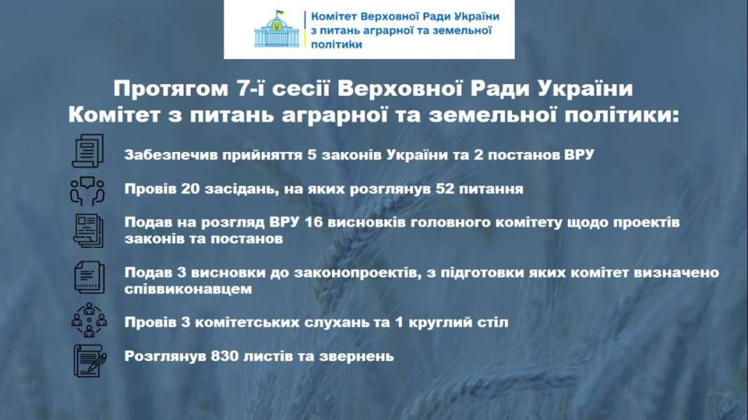 У зв’язку з військовою агресією російської федерації впродовж сьомої сесії діяльність Комітету була зосереджена на підготовці законопроектів, які максимально спрощують ведення сільського господарства в умовах воєнного стану та зменшують бюрократичне навантаження на бізнес.