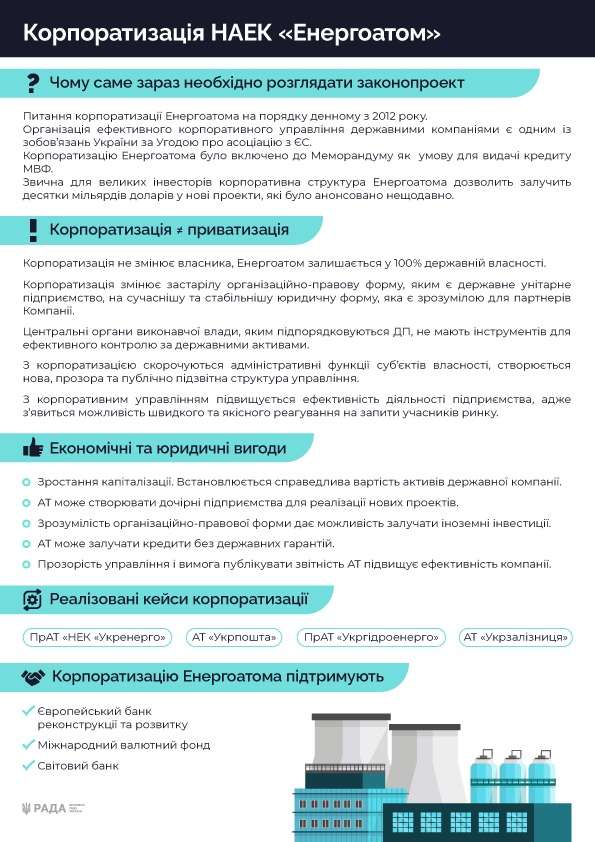 Реалізація положень законопроекту сприятиме виконанню міжнародних зобов’язань України, встановлених Законом України «Про ратифікацію Гарантійної угоди (Україна: Комплексна (Зведена) програма підвищення рівня безпеки енергоблоків атомних електростанцій) між Україною та Європейським банком реконструкції та розвитку» від 15 травня 2014р. №1267-VII, щодо створення акціонерного товариства державного сектору економіки та ефективності функціонування енергетичної галузі України та конкурентоспроможності українського оператора ядерної установки, відрахування податків, зборів (обов'язкових платежів) до бюджетів усіх рівнів. Крім того, нова корпоративна структура «Енергоатому» підвищить прозорість державного підприємства та оптимізує управлінські процеси у ньому.