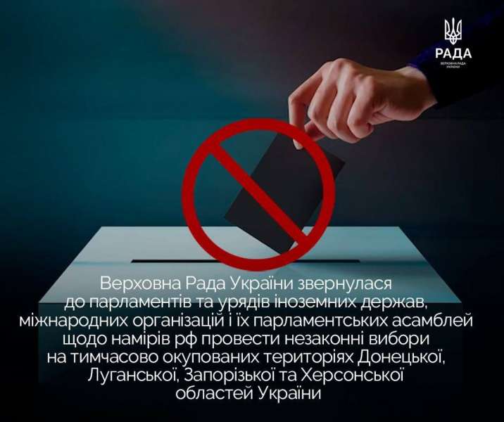 Верховна Рада України закликає міжнародну спільноту не визнавати, у разі їх проведення, легітимність будь-яких «виборів» на тимчасово окупованих частинах території України, а також легітимність структур, які їх організовують.