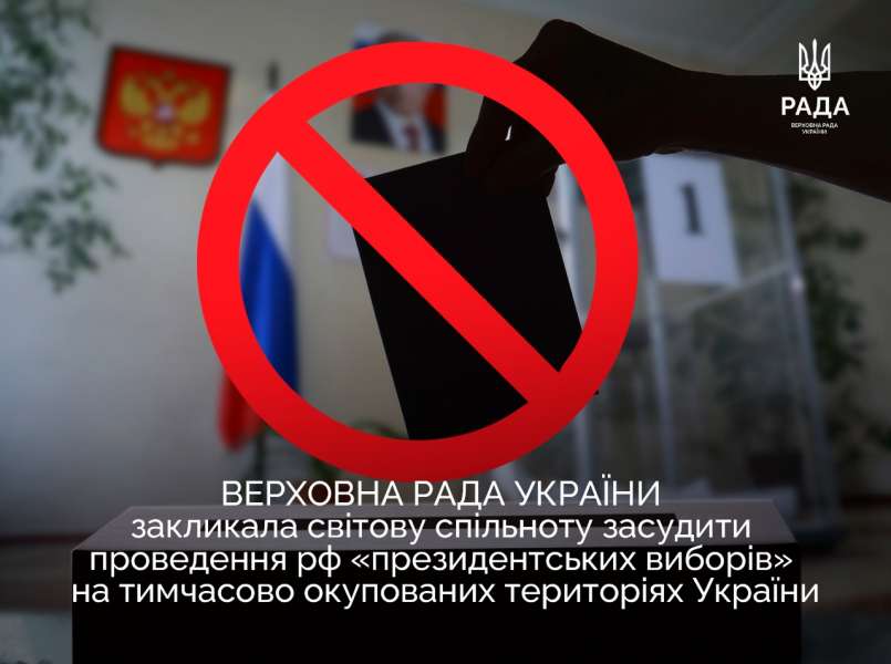Верховна Рада України прийняла Постанову «Про Звернення Верховної Ради України до урядів та парламентів іноземних держав, міжнародних організацій, парламентських асамблей у зв’язку з проведенням російською федерацією "президентських виборів" на тимчасово окупованій території України» (р.№11078)