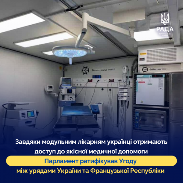 Ратифікований Верховною Радою України договір між Україною і Французькою Республікою щодо підтримки проєкту із влаштування модульних лікарень дозволить надати максимально швидко доступ нашим громадянам до якісної медичної допомоги.