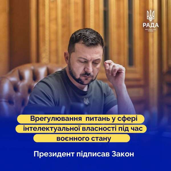 Президент України підписав Закон України «Про визнання таким, що втратив чинність, Закону України «Про захист інтересів осіб у сфері інтелектуальної власності під час дії воєнного стану, введеного у зв’язку із збройною агресією Російської Федерації проти України» №43620-ІX від 16.04.2025, (реєстр. №9383 законопроекту), з опрацювання якого Комітет з питань економічного розвитку визначено головним.