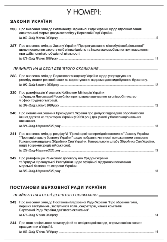 У віснику від 21 серпня 2020 року опубліковано постанови Верховної Ради України, прийняті на другій сесії дев’ятого скликання, зокрема, «Про стан соціального захисту дітей та невідкладні заходи, спрямовані на захист прав дитини в Україні». Документ направлений на вирішення накопичених проблемних питань у сфері забезпечення та захисту прав дитини та нових викликів, пов’язаних із збройним конфліктом на сході України, безсистемним реформуванням базових процедур та структур, завдання яких полягає у забезпеченні та дотриманні прав дітей.