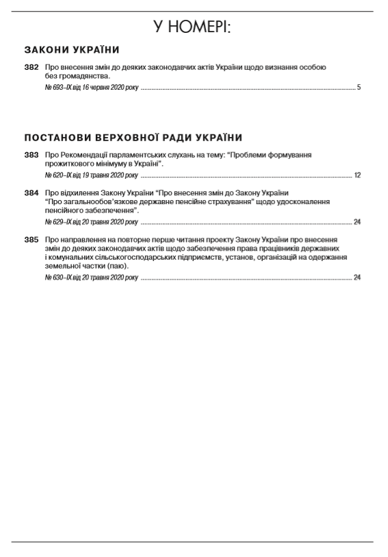 Зокрема, у віснику опубліковано Закон «Про внесення змін до деяких законодавчих актів України щодо визнання особою без громадянства», яким створюється процедура визнання особою без громадянства, що надає змогу таким особам законно перебувати на території України, отримати документ, що посвідчує їх особу та підтверджує законність проживання на території України - посвідку на тимчасове проживання та посвідчення особи без громадянства для виїзду за кордон, а за умови проживання на території України у зазначеному статусі понад 2 роки – отримати дозвіл на імміграцію та посвідку на постійне проживання.