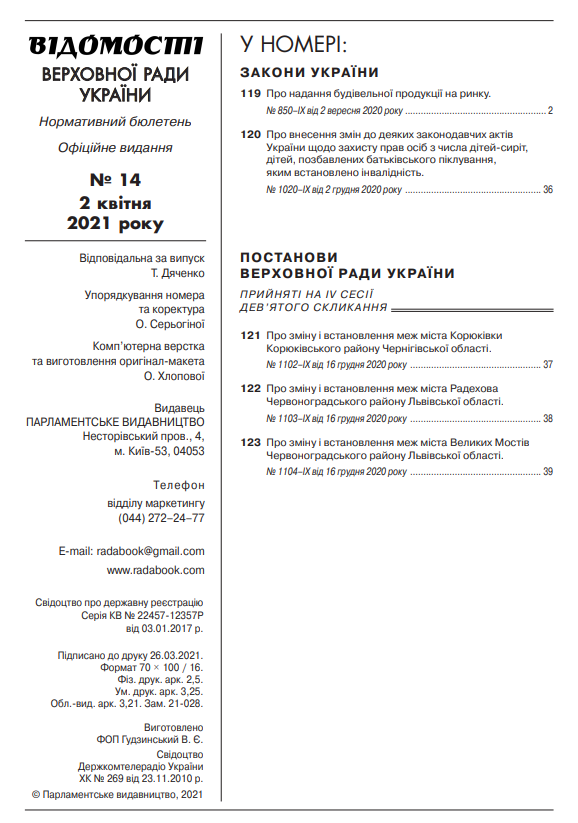 У черговому номері збірника нормативно-правових актів парламентського видавництва «Відомості Верховної Ради України» №14 від 2 квітня 2021 року опубліковано два закони і ряд постанов, прийнятих під час четвертої і п’ятої сесій Верховної Ради дев’ятого скликання.