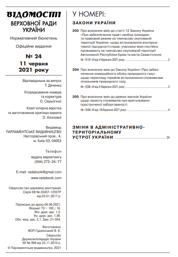 У черговому номері збірника нормативно-правових актів парламентського видавництва «Відомості Верховної Ради України» №24 від 11 червня 2021 року опубліковано ряд Законів, прийнятих під час п’ятої сесії Верховної Ради дев’ятого скликання.