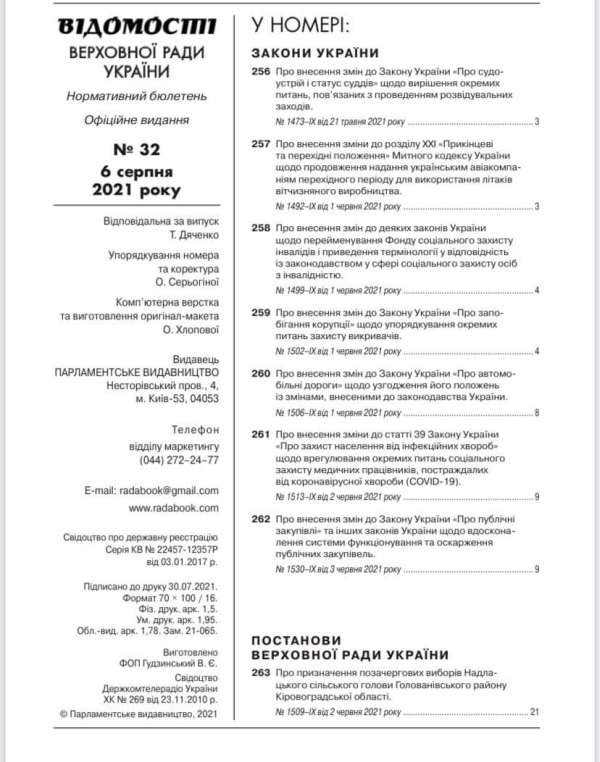 У черговому номері збірника нормативно-правових актів парламентського видавництва «Відомості Верховної Ради України» №32 від 6 серпня 2021 року опубліковано низку законів та постанов, прийнятих під час п’ятої сесії Верховної Ради дев’ятого скликання.