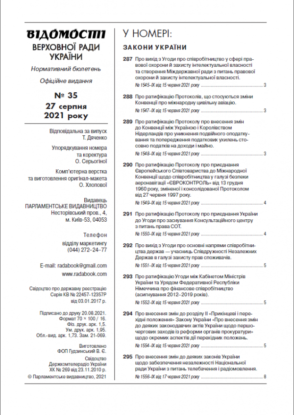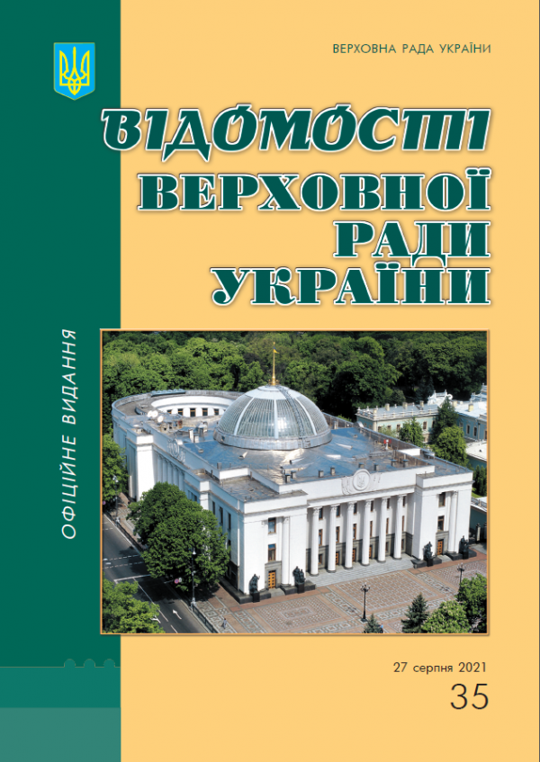 У черговому номері збірника нормативно-правових актів парламентського видавництва «Відомості Верховної Ради України» №35 від 27 серпня 2021 року опубліковано ряд законів та постанова, прийняті під час п’ятої сесії Верховної Ради дев’ятого скликання.