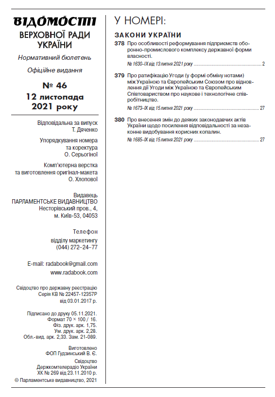 У черговому номері збірника нормативно-правових актів парламентського видавництва «Відомості Верховної Ради України» №46 від 12 листопада 2021 року опубліковано ряд законів, прийнятих під час п’ятої сесії Верховної Ради дев’ятого скликання.