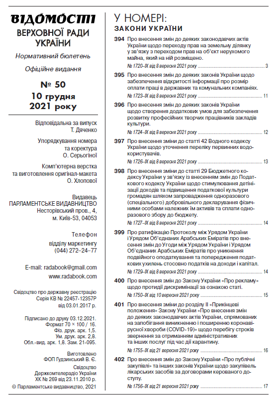У черговому номері збірника нормативно-правових актів парламентського видавництва «Відомості Верховної Ради України» №50 від 10 грудня 2021 року опубліковано ряд законів і постанов, прийнятих під час шостої сесії Верховної Ради дев’ятого скликання.