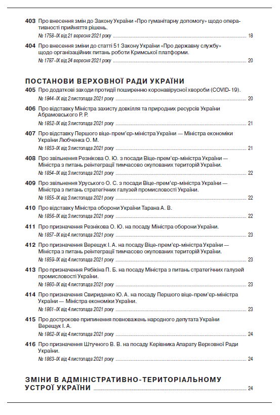 - «Про внесення зміни до розділу II «Прикінцеві положення» Закону України «Про внесення змін до деяких законодавчих актів України, спрямованих на запобігання виникненню і поширенню коронавірусної хвороби (COVID-19)» щодо перебігу строків звернення за отриманням адміністративних та інших послуг під час дії карантину», № 1755–IХ, чинний з 10 жовтня 2021 року. Закон поновлює перебіг строків надання адміністративних послуг, що були призупинені на період встановлення карантину;