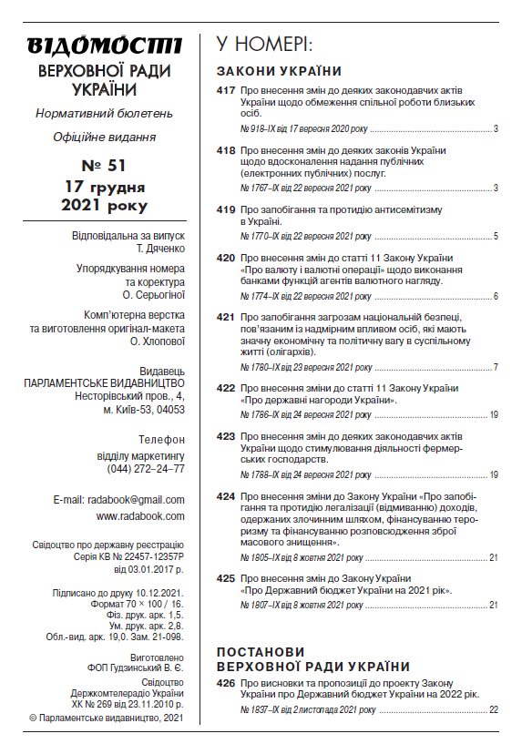 У черговому номері збірника нормативно-правових актів парламентського видавництва «Відомості Верховної Ради України» №51 від 17 грудня 2021 року опубліковано ряд законів і постанов, прийнятих під час шостої сесії Верховної Ради дев’ятого скликання.