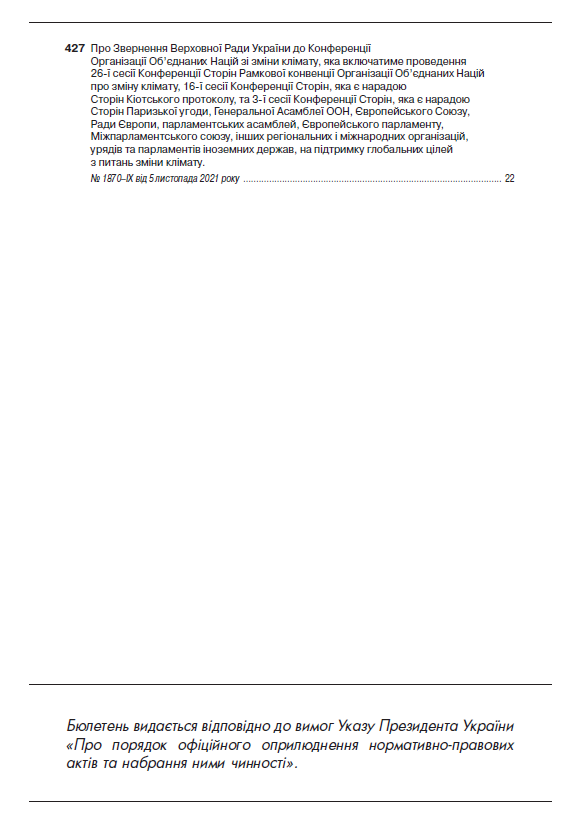 Окрім того, у Відомостях опубліковані Постанови Верховної Ради, якими затверджено висновки та пропозиції до проекту Закону України про Державний бюджет України на 2022 рік (№ 1837–IХ) і Звернення Верховної Ради України до Конференції Організації Об’єднаних Націй зі зміни клімату, яка включатиме проведення 26-ї сесії Конференції Сторін Рамкової конвенції Організації Об’єднаних Націй про зміну клімату, 16-ї сесії Конференції Сторін, яка є нарадою Сторін Кіотського протоколу, та 3-ї сесії Конференції Сторін, яка є нарадою Сторін Паризької угоди, Генеральної Асамблеї ООН, Європейського Союзу, Ради Європи, парламентських асамблей, Європейського парламенту, Міжпарламентського союзу, інших регіональних і міжнародних організацій, урядів та парламентів іноземних держав, на підтримку глобальних цілей з питань зміни клімату (№ 1870–IХ).