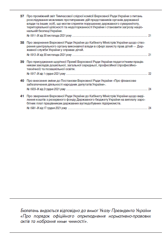 - «Про внесення зміни до Постанови Верховної Ради України «Про фінансове забезпечення діяльності народних депутатів України», № 1933–IХ, якою тимчасово, у період з 1 по 31 грудня 2021 року встановлюється місячний фонд для оплати праці помічників-консультантів народного депутата України в розмірі 50 прожиткових мінімумів.