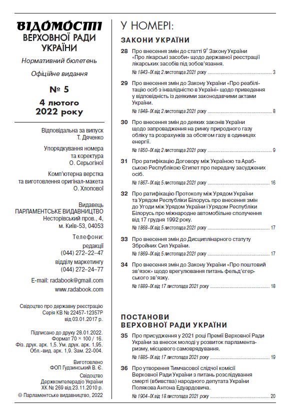 У черговому номері збірника нормативно-правових актів парламентського видавництва «Відомості Верховної Ради України» №5 від 4 лютого 2022 року опубліковано ряд законів і постанов, прийнятих під час шостої сесії Верховної Ради дев’ятого скликання.