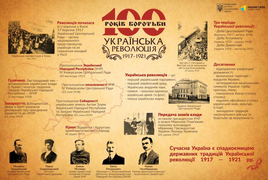 В рамках всеукраїнської інформаційної кампанії до 100-ліття Української революції 1917-1921 років, в кулуарах ІІ поверху будинку Верховної Ради України (вул. Грушевського, 5) відбудеться відкриття фотоекспозиції «100 років боротьби. Українська революція 1917-1921р.р.».