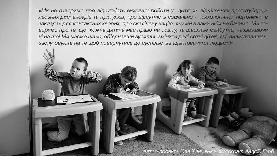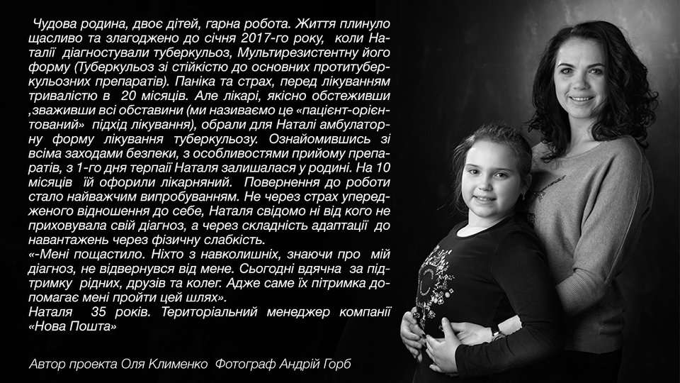 Фотовиставка “Туберкульоз очима пацієнта” з одного боку розповідає про щасливі історії тих, кому вдалося подолати хворобу, про реальний результат успішної амбулаторної моделі лікування хворих на туберкульоз в Україні, а з іншого – про тривале лікування дітей у протитуберкульозних диспансерах.